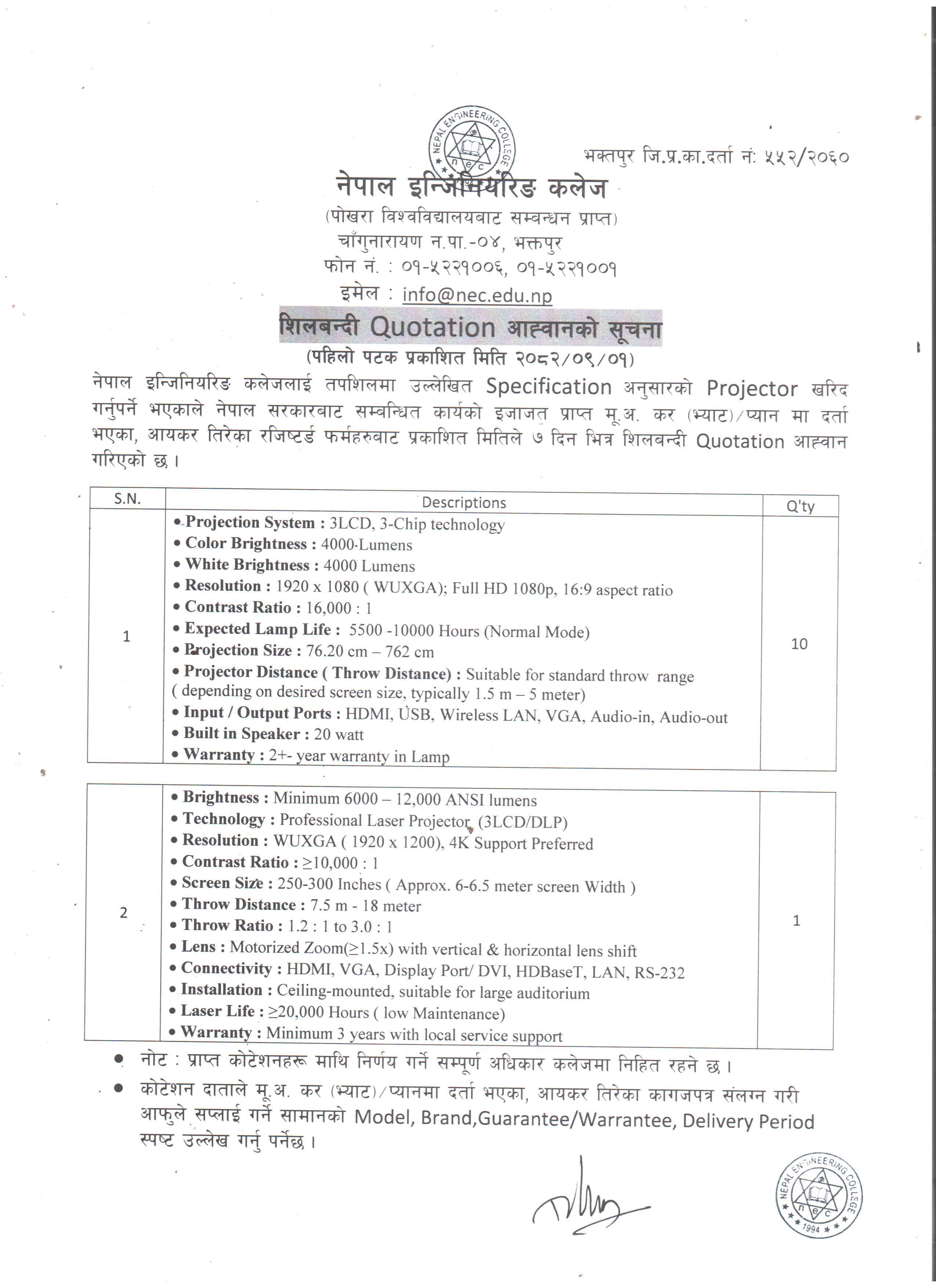 बसरुट सम्बन्धि सूचना । नयाँ वर्ष २०८३ को शुभकामना तथा कलेज बिदा सम्बन्धि सूचना । भावपूर्ण श्रद्धाञ्जलि । 2nd M.Sc. Admission List March 2026 Result of M.Sc. Entrance 2026 March बसरुट सम्बन्धि सूचना । Semester End Vacation (Fall 2025 Semester) भावपूर्ण श्रद्धाञ्जलि । चैतेदशैमा कलेज बिदा सम्बन्धि सूचना । nec Prospectus 2026 छपाई सम्बन्धि शिलबन्दी कोटेशन आह्वानको सूचना । नेपाल इन्जिनियरिङ कलेजको भाडामा बस संचालन सम्बन्धी सिलबन्दी बोलपत्र आह्वान. ने.ई.क क्याफे संचालन सम्बन्धि शिलबन्दी कोटेशन आह्वानको सूचना । बसरुट सम्बन्धि सूचना । फागु पुर्णिमा (होली), प्रतिनिधि सभा निर्वाचन तथा नारी दिवस मा कलेज बिदा सम्बन्धि सूचना । Notice of Bus Route. Elective Final Exam Notice (Fall 2025) Extension Notice for Examination form Submission Date (Fall 2025) Bus Route सम्बन्धि सूचना । महाशिवरात्रीमा कलेज बिदा सम्बन्धि सूचना । महाशिवरात्रीमा कलेज बिदा सम्बन्धि सूचना । कार्यालय समय परिर्वतन सम्बन्धि सूचना । Notice for Exam Form Fall 2025 ने.ई.क क्याफे संचालन सम्बन्धि शिलबन्दी कोटेशन आह्वानको सूचना । Exam Form Notice Fall Semester 2025 Notice Assessment Fall 2025 Farewell कार्यक्रम सम्बन्धि सूचना । खेलकुद उत्सव २०८२ मा कुपन तथा रकम वितरण सम्बन्धि सूचना । Notice After Dabi Birodh Farewell Program 2082 (Subject Gold Award 2025) भावपूर्ण श्रद्धाञ्जली मकर सङ्क्रान्ती (माघी पर्व) मा कलेज बिदा सम्बन्धि सूचना । सूचना । उम्मेदवार छनौट तथा दाबीबिरोध सम्बन्धी सूचना । दाबी बिराेध सम्बन्धी सूचना (Semester Topper Scholarship) खेलकुद उत्सव २०२५ सम्बन्धि छलफलमा उपस्थिती हुने सूचना । Call for Interview. भावपूर्ण श्रद्धाञ्जली Quotation for Smart Board Quotation for Projector खेलकुद उत्सव २०८२ सम्बन्धमा छलफल सम्बन्धि सूचना । खेलकुद सप्ताह २०८२ सम्बन्धि सूचना । Notice Chance Exam Final Year Spring Semester 2025 Smart Board Quotation Notice Projector Multimedia Quotation Notice Notice for Rechecking/Retotaling Spring 2025 Notice UT Fall 2025 Academic Callender Fall Semester 2025 College Fee Notice Fall 2025 [NEPAL ENGINEERING COLLEGE STUDENT COUNCIL, (NESCo)] सम्बन्धि बिधान सुधार तथा संभावित निर्वाचन मिति तयको लागि सम्पर्क गर्ने सम्बन्धि सूचना । NEPAL ENGINEERING COLLEGE STUDENT COUNCIL (NESCo) पुनर्गठन सम्बन्धि छलफलमा उपस्थित हुने सम्बन्धि सूचना । PU Registration Notice for 2025 Batch कलेज समय परिर्वतन सम्बन्धि सूचना । शिक्षक उम्मेदवार छनौट सम्बन्धी सूचना । बस पास सम्वन्धी सूचना । कक्षा सञ्चालन सम्बन्धी सूचना ०८२.०७.१७ । Call for Interview Bus Route सम्बन्धि सूचना । 2025 Batch मा भर्ना भएका बिद्यार्थीहरू को Orientation Program सम्बन्धि सूचना । Notice Retotaling/Rechecking Spring 2025 (Final Year) nec Provincial Scholarship- Awarded List 2025 Result of nec Provincial Scholarship Exam 2025 (Sep. 21, 025) Result of nec Community Scheme Entrance Exam-2025 (Sep. 21, 025) Notice for First Admission List (M.S. Construction Management) nec-Vacancy_2025 Notice of M.Sc. Construction Management Entrance Exam Date, Time, and Venue प्रादेशिक छात्रवृत्ति तथा Community Scheme को लागि प्रवेश परीक्षासम्बन्धी ०८२.०५.२९ विज्ञप्ति ०८२.०५.२९ Notice for M.Sc. CM Entrance Exam शैक्षिकसत्र (Fall 2025 Semester) संचालन सम्वन्धि सूचना । nec-BDH Entrance Result and Admission Notice बसरुट सम्बन्धि सूचना । प्रादेशिक छात्रवृत्ति र Community Scheme को लागि प्रवेश परीक्षासम्बन्धी सूचना Admission Office Hours on Saturday प्रवेश परी